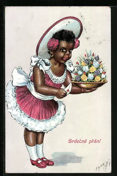 AK Mädchen bringt Blumenkorb und Brief zum Geburtstag