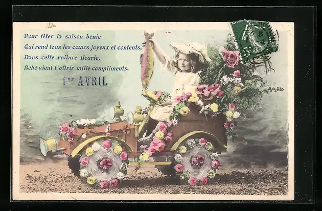 AK Mädchen fährt am 1. April mit Fisch in einem Auto