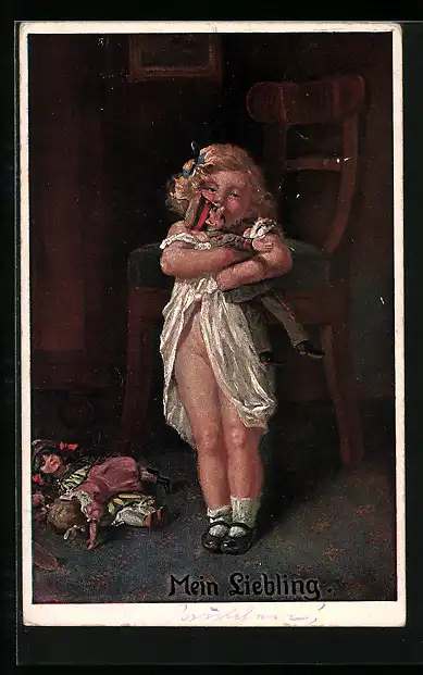 AK Mädchen hält Soldaten-Puppe fest im Arm