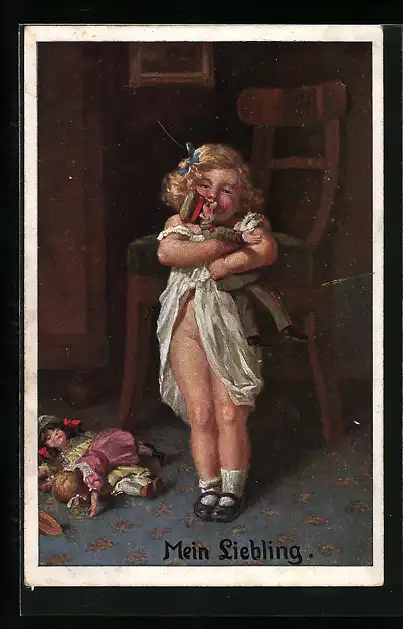 AK Mädchen hält Soldaten-Puppe fest im Arm