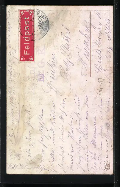 Personenbezogene Daten auf der Rückseite der Karte wurden durch blauen Textmarker unkenntlich gemacht. Die blauen Stellen sind auf die Vorderseite durchgeweicht und wirken sich negativ auf das Postkartenfoto aus
