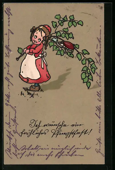 AK Mädchen hält Zweig mit Maikäfer in der Hand, Pfingstgruss