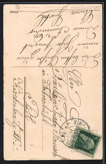 Personenbezogene Daten auf der Rückseite der Karte wurden durch blauen Textmarker unkenntlich gemacht. Die blauen Stellen sind auf die Vorderseite durchgeweicht und wirken sich negativ auf das Postkartenfoto aus