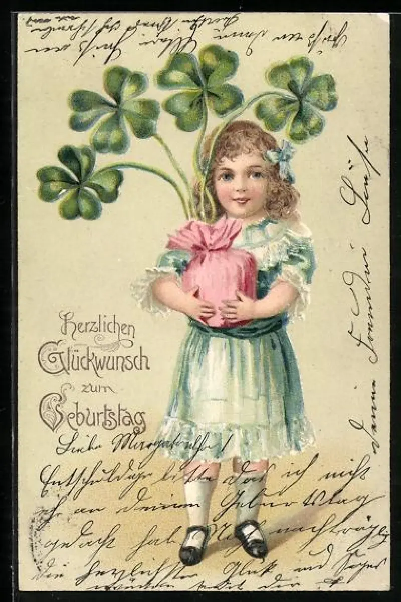 AK Mädchen im Rüschenkleid mit Kleeblättern