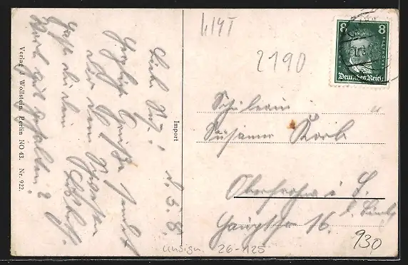 Personenbezogene Daten auf der Rückseite der Karte wurden durch blauen Textmarker unkenntlich gemacht. Die blauen Stellen sind auf die Vorderseite durchgeweicht und wirken sich negativ auf das Postkartenfoto aus