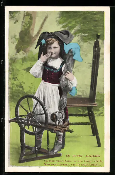 AK Mädchen in Elsässer Tracht mit Spinnrad