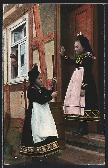 AK Mädchen in hessischen Trachten beim Butterstossen