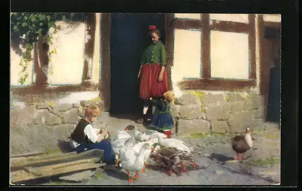 AK Mädchen in hessischer Tracht mit einer Schar Gänse