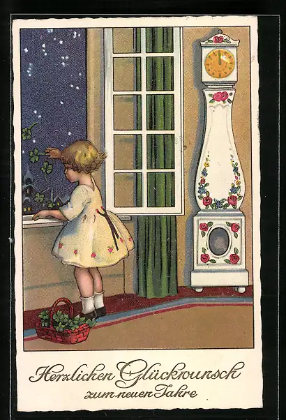 AK Mädchen lässt Kleeblätter aus Fenster fallen, Neujahr
