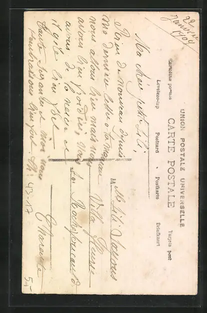 Personenbezogene Daten auf der Rückseite der Karte wurden durch blauen Textmarker unkenntlich gemacht. Die blauen Stellen sind auf die Vorderseite durchgeweicht und wirken sich negativ auf das Postkartenfoto aus