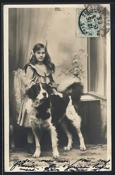 AK Mädchen mit Bernhardiner vor Fotokulisse