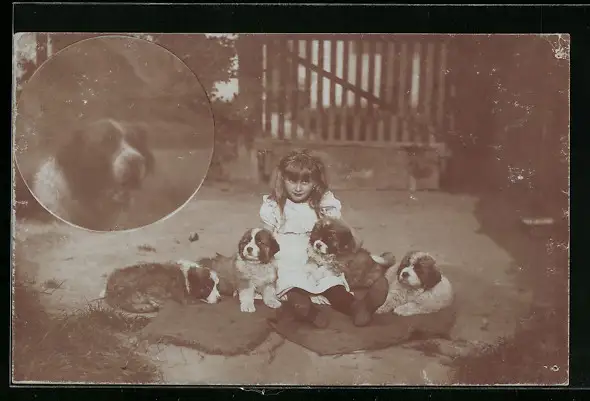 AK Mädchen mit Bernhardinerwelpen auf einer Decke im Garten