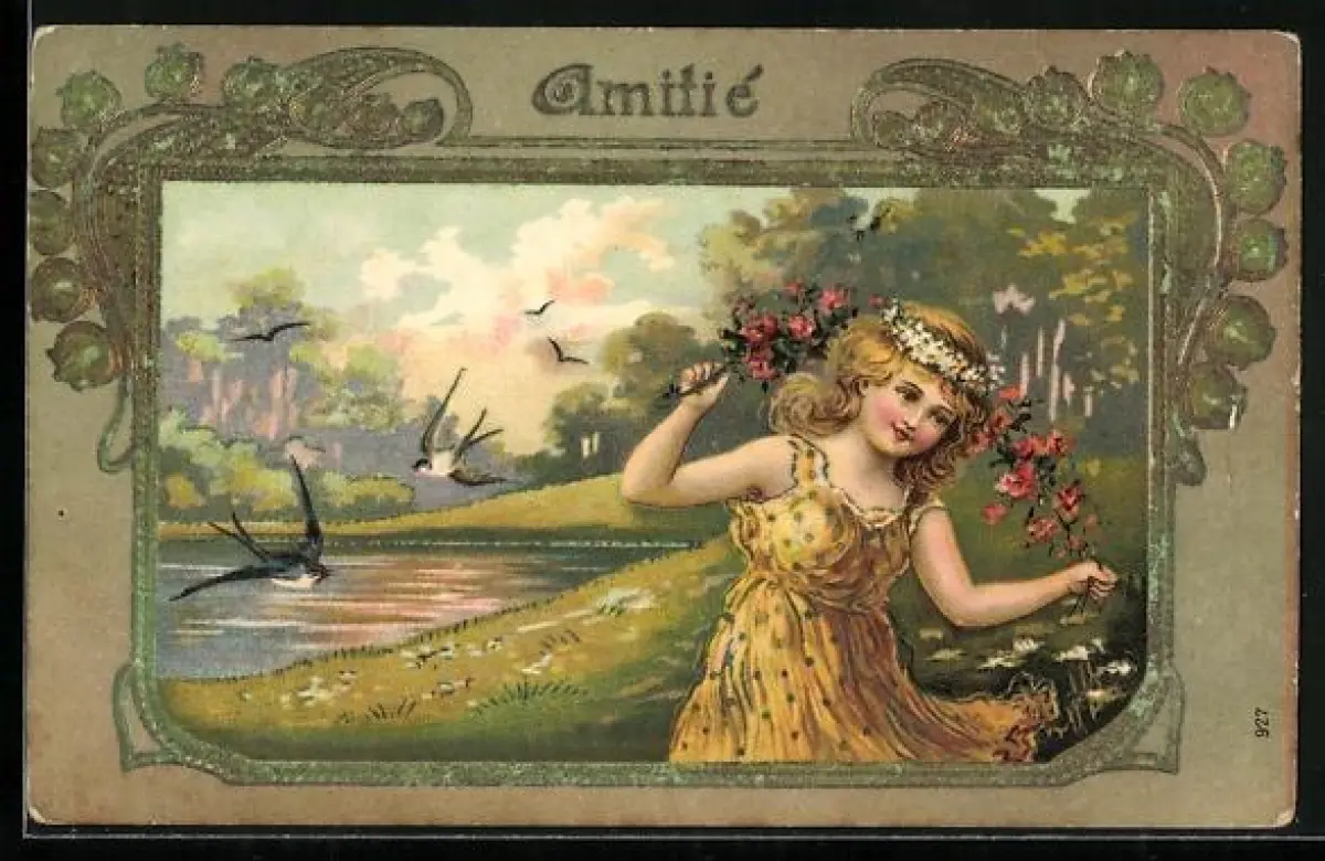 AK Mädchen mit Blumen tanzt auf einer Wiese