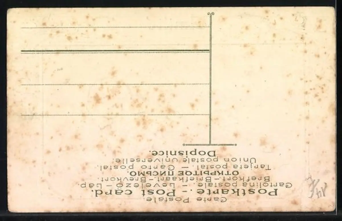 Personenbezogene Daten auf der Rückseite der Karte wurden durch blauen Textmarker unkenntlich gemacht. Die blauen Stellen sind auf die Vorderseite durchgeweicht und wirken sich negativ auf das Postkartenfoto aus