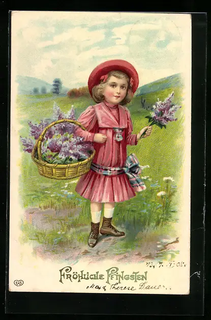 AK Mädchen mit Blumenkorb zu Pfingsten