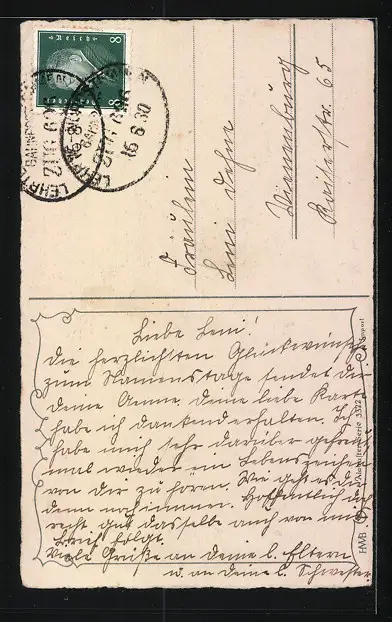 Personenbezogene Daten auf der Rückseite der Karte wurden durch blauen Textmarker unkenntlich gemacht. Die blauen Stellen sind auf die Vorderseite durchgeweicht und wirken sich negativ auf das Postkartenfoto aus