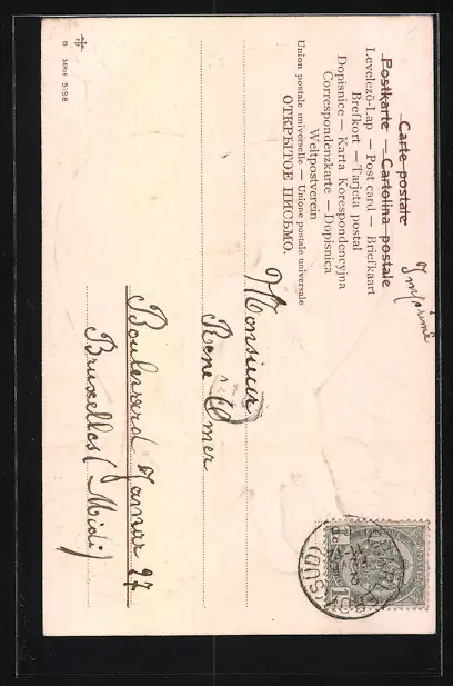 Personenbezogene Daten auf der Rückseite der Karte wurden durch blauen Textmarker unkenntlich gemacht. Die blauen Stellen sind auf die Vorderseite durchgeweicht und wirken sich negativ auf das Postkartenfoto aus