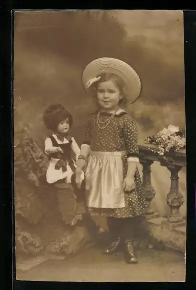 AK Mädchen mit Hut und Schürze spielt mit ihrer Puppe