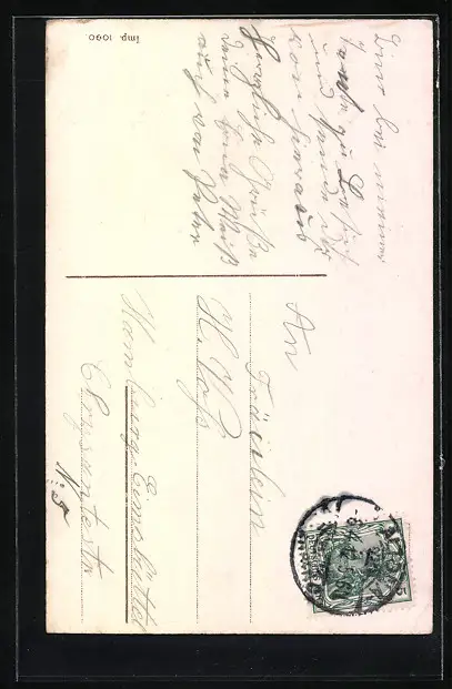 Personenbezogene Daten auf der Rückseite der Karte wurden durch blauen Textmarker unkenntlich gemacht. Die blauen Stellen sind auf die Vorderseite durchgeweicht und wirken sich negativ auf das Postkartenfoto aus