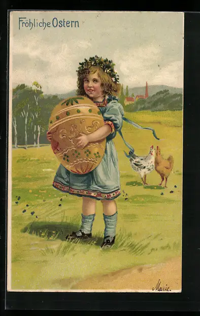AK Mädchen mit Osterei und Hühnern im Grünen