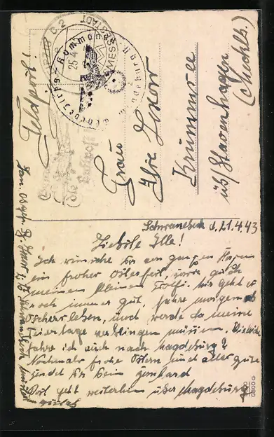 Personenbezogene Daten auf der Rückseite der Karte wurden durch blauen Textmarker unkenntlich gemacht. Die blauen Stellen sind auf die Vorderseite durchgeweicht und wirken sich negativ auf das Postkartenfoto aus