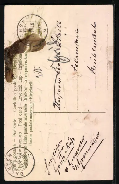 Personenbezogene Daten auf der Rückseite der Karte wurden durch blauen Textmarker unkenntlich gemacht. Die blauen Stellen sind auf die Vorderseite durchgeweicht und wirken sich negativ auf das Postkartenfoto aus