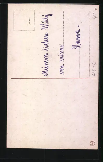 Personenbezogene Daten auf der Rückseite der Karte wurden durch blauen Textmarker unkenntlich gemacht. Die blauen Stellen sind auf die Vorderseite durchgeweicht und wirken sich negativ auf das Postkartenfoto aus