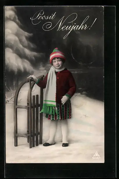 AK Mädchen mit Schlitten wünscht Prosit Neujahr