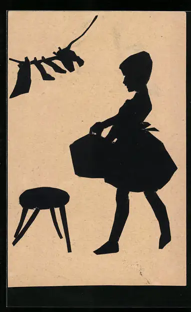 AK Mädchen mit Wäschekorb vor der Wäscheleine, Scherenschnitt
