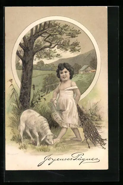 AK Mädchen mit Zweigen und Lämmchen