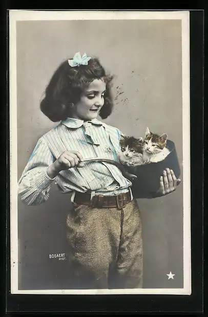 AK Mädchen mit zwei kleinen Katzen im Topf