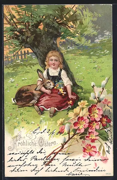 AK Mädchen sitzt mit Osterhasen unter einem Baum