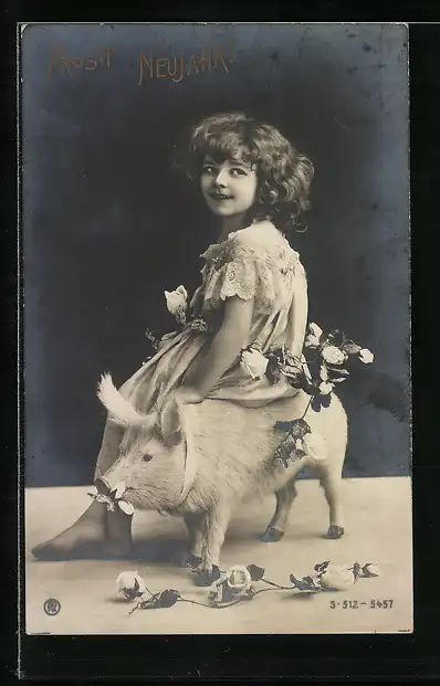 AK Mädchen sitzt zu Neujahr auf einem Schwein