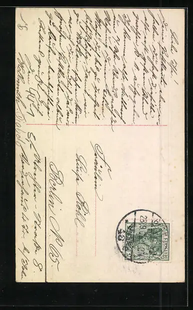 Personenbezogene Daten auf der Rückseite der Karte wurden durch blauen Textmarker unkenntlich gemacht. Die blauen Stellen sind auf die Vorderseite durchgeweicht und wirken sich negativ auf das Postkartenfoto aus