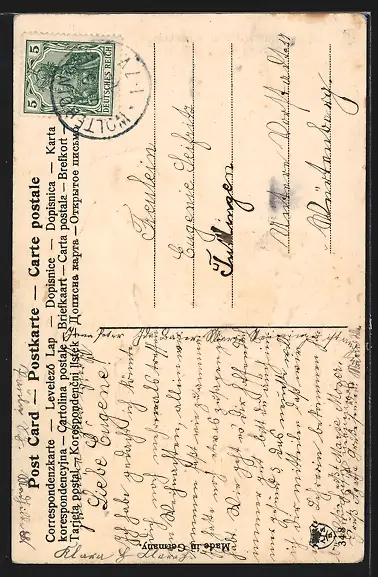 Personenbezogene Daten auf der Rückseite der Karte wurden durch blauen Textmarker unkenntlich gemacht. Die blauen Stellen sind auf die Vorderseite durchgeweicht und wirken sich negativ auf das Postkartenfoto aus