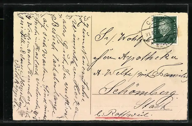 Personenbezogene Daten auf der Rückseite der Karte wurden durch blauen Textmarker unkenntlich gemacht. Die blauen Stellen sind auf die Vorderseite durchgeweicht und wirken sich negativ auf das Postkartenfoto aus