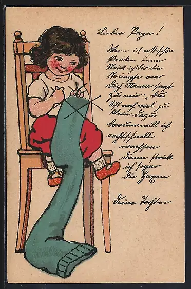 AK Mädchen strickt einen Schal, Kriegshilfe