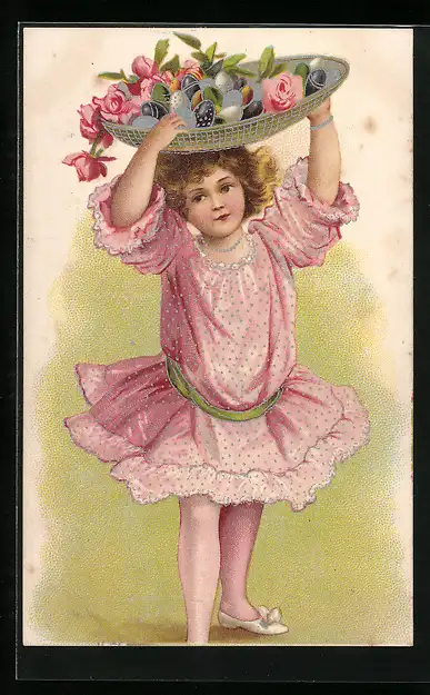 AK Mädchen trägt Korb mit Ostereiern und Rosen