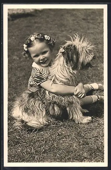 AK Mädchen umarmt ihren Terrier auf einer Wiese