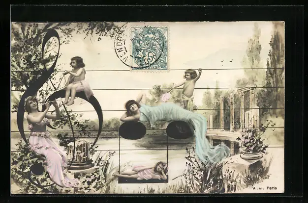 AK Mädchen und Frauen machen es sich auf Musiknoten bequem