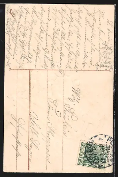 Personenbezogene Daten auf der Rückseite der Karte wurden durch blauen Textmarker unkenntlich gemacht. Die blauen Stellen sind auf die Vorderseite durchgeweicht und wirken sich negativ auf das Postkartenfoto aus