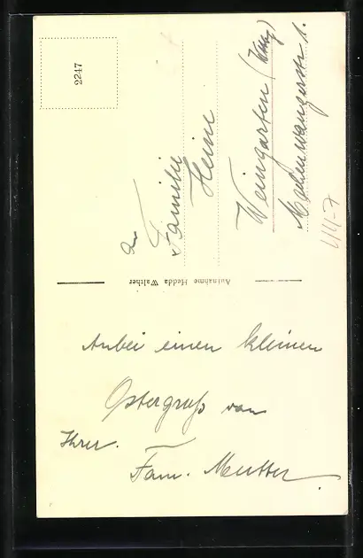 Personenbezogene Daten auf der Rückseite der Karte wurden durch blauen Textmarker unkenntlich gemacht. Die blauen Stellen sind auf die Vorderseite durchgeweicht und wirken sich negativ auf das Postkartenfoto aus