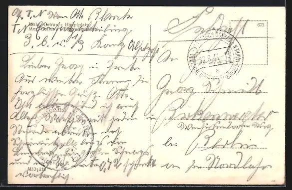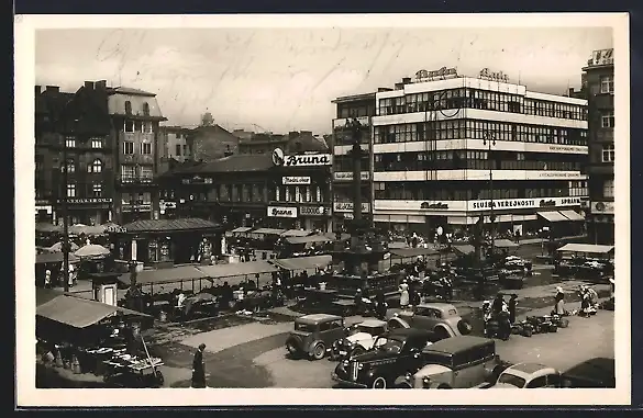 AK Mähr. Ostrau, Hauptplatz mit Geschäften und Autos