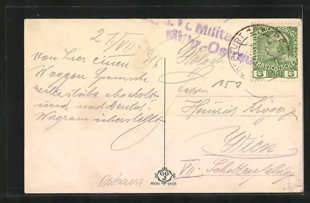 gelaufen 1916, Eckknick li. unten, Stempelspur, guter Zustand
