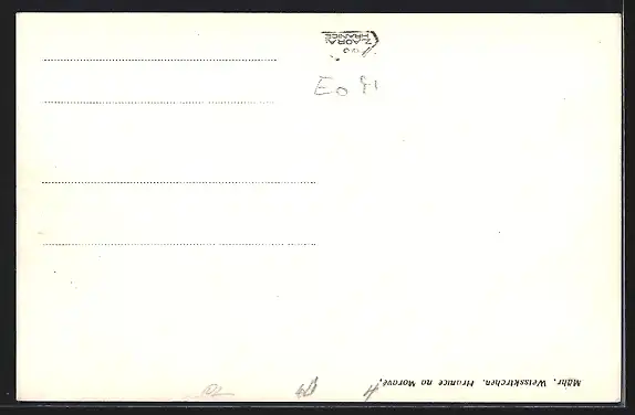 Personenbezogene Daten auf der Rückseite der Karte wurden durch blauen Textmarker unkenntlich gemacht. Die blauen Stellen sind auf die Vorderseite durchgeweicht und wirken sich negativ auf das Postkartenfoto aus