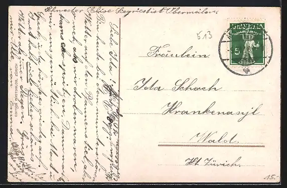 Personenbezogene Daten auf der Rückseite der Karte wurden durch blauen Textmarker unkenntlich gemacht. Die blauen Stellen sind auf die Vorderseite durchgeweicht und wirken sich negativ auf das Postkartenfoto aus