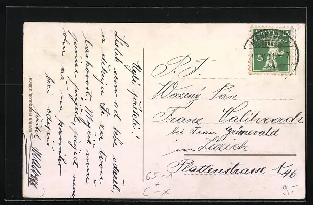 Personenbezogene Daten auf der Rückseite der Karte wurden durch blauen Textmarker unkenntlich gemacht. Die blauen Stellen sind auf die Vorderseite durchgeweicht und wirken sich negativ auf das Postkartenfoto aus