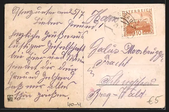 Personenbezogene Daten auf der Rückseite der Karte wurden durch blauen Textmarker unkenntlich gemacht. Die blauen Stellen sind auf die Vorderseite durchgeweicht und wirken sich negativ auf das Postkartenfoto aus