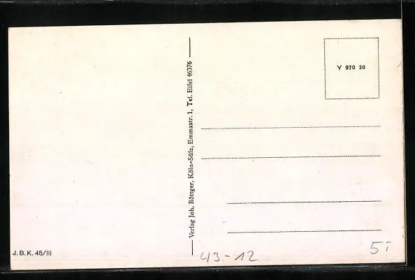 Personenbezogene Daten auf der Rückseite der Karte wurden durch blauen Textmarker unkenntlich gemacht. Die blauen Stellen sind auf die Vorderseite durchgeweicht und wirken sich negativ auf das Postkartenfoto aus