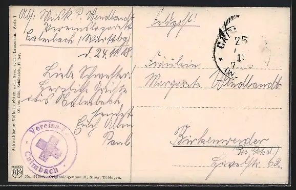 Personenbezogene Daten auf der Rückseite der Karte wurden durch blauen Textmarker unkenntlich gemacht. Die blauen Stellen sind auf die Vorderseite durchgeweicht und wirken sich negativ auf das Postkartenfoto aus